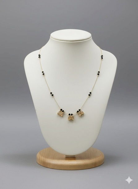 हा Mangalsutra Necklace Fine आणि Slim Design मध्ये तयार केलेला आहे. Necklace मध्ये लहान Black Beads (काळे मणी) आणि पातळ Gold Tone Chain यांचे सुंदर Combination दिलेले आहे, ज्यामुळे Mangalsutra ला Clean आणि Elegant Look मिळतो.