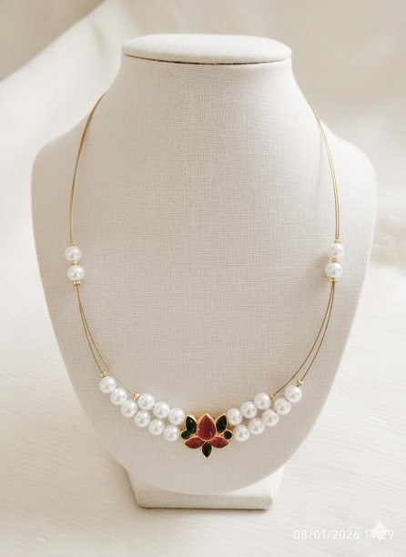 Necklace च्या मध्यभागी दिलेला Lotus Shape Pendant हा या Jewellery चा मुख्य आकर्षणबिंदू आहे. या Pendant वर सुंदर Red & Green Stone Work केलेले असून ते पारंपरिक Indian Jewellery Touch देतात. Pendant च्या आजूबाजूला Pearl Arrangement असल्यामुळे Necklace अधिक Elegant आणि Graceful दिसतो.
