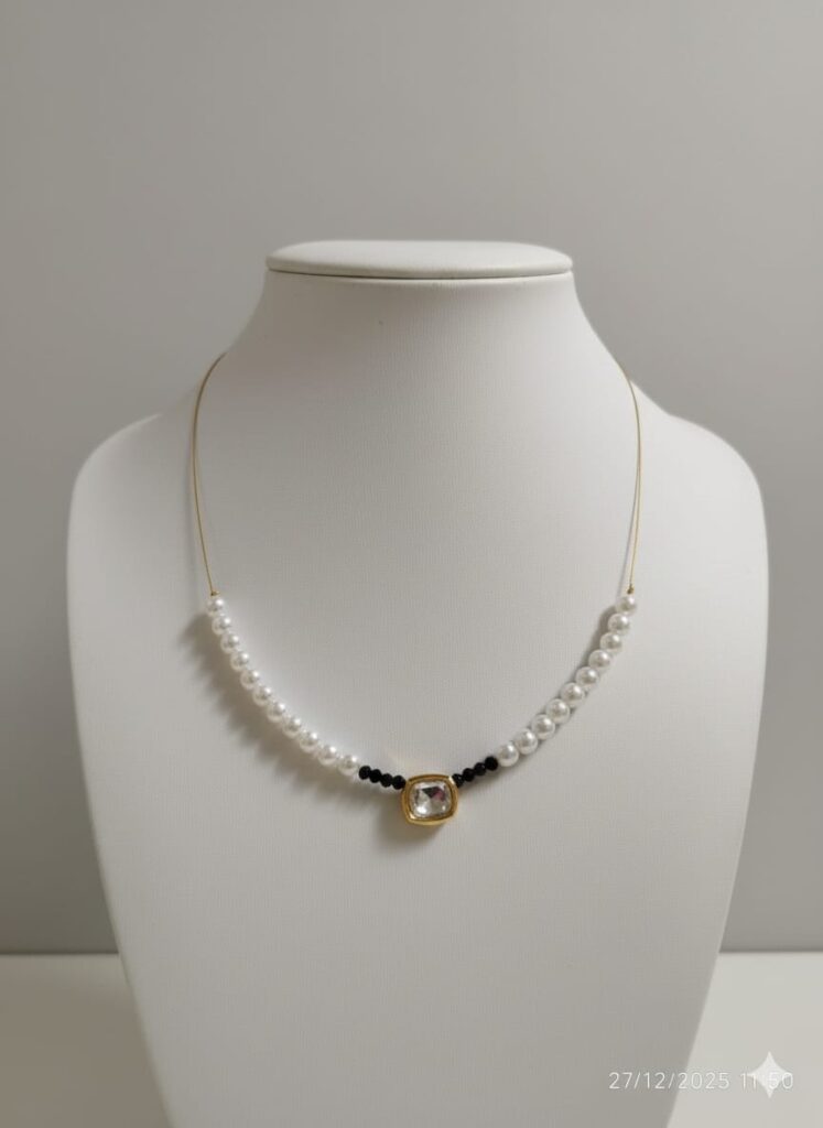 हा Pearl Necklace Fine Gold Tone Chain मध्ये तयार केलेला आहे. Necklace मध्ये High Quality Artificial Pearls वापरण्यात आलेले असून त्यांची Smooth Finish आणि Uniform Shape यामुळे दागिन्याला Premium Look मिळतो.