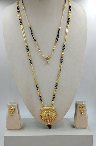या मंगळसूत्राचे मुख्य आकर्षण म्हणजे मोठा आणि नक्षीदार Gold Finish Pendant. पारंपरिक कोरीव काम, लाल व काळ्या स्टोनचा (Red & Black Stones) सुंदर वापर आणि लटकणारी डिझाइन यामुळे पेंडंट खूपच उठून दिसतो. सोबत मिळणारे मॅचिंग Traditional Earrings या सेटला परफेक्ट कम्प्लीट लुक देतात.