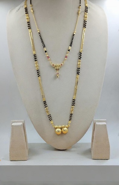 मंगळसूत्राच्या खालच्या बाजूस असलेला नाजूक Gold Finish Pendant आणि त्याखाली लटकणारे गोल सोनेरी बॉल्स यामुळे याचा लुक अधिक उठावदार वाटतो. मधल्या लेयरमध्ये दिलेला छोटा Designer Pendant हा सेटला खास आणि युनिक टच देतो.