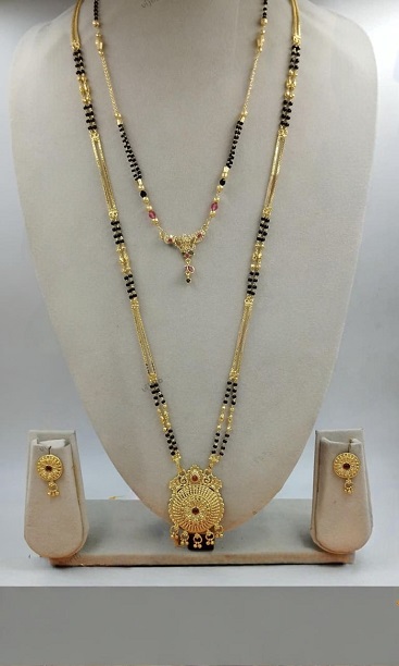 हा भव्य आणि आकर्षक Artificial Long Mangalsutra Set पारंपरिक महाराष्ट्रीयन डिझाइनमध्ये तयार करण्यात आलेला आहे. काळे मणी (Black Beads) आणि सोनेरी रंगाची (Gold Tone) लांब चेन यांचे सुंदर कॉम्बिनेशन या मंगळसूत्राला रिच आणि एलिगंट लुक देते. डबल लेयर डिझाइनमुळे हा सेट गळ्यात अतिशय ग्रेसफुल दिसतो.