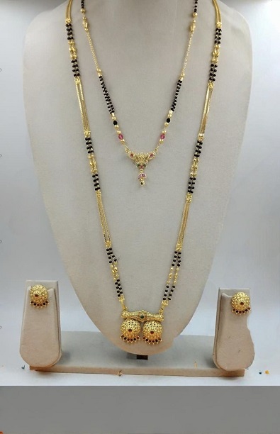 हा अत्यंत देखणा आणि पारंपरिक Artificial Long Mangalsutra Set खास ट्रेडिशनल डिझाइनमध्ये तयार करण्यात आला आहे. काळे मणी (Black Beads) आणि सोनेरी रंगाची (Gold Tone) लांब चेन यांचे सुंदर कॉम्बिनेशन या मंगळसूत्राला रिच आणि क्लासिक लुक देते. डबल लेयर डिझाइनमुळे हा सेट गळ्यात खूपच एलिगंट दिसतो.