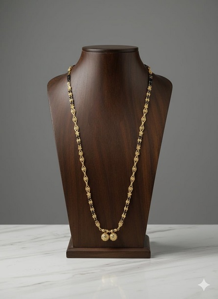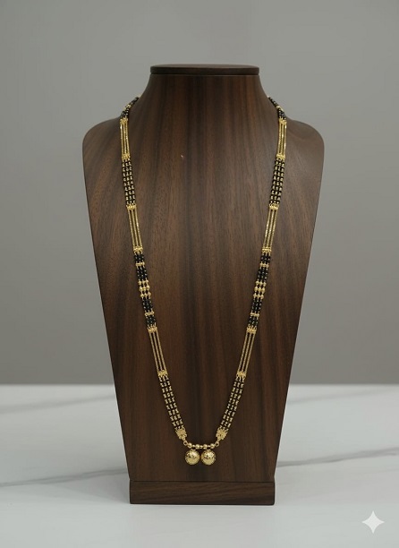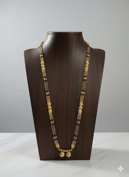 या नेकलेसमध्ये वापरलेले black beads पारंपरिक मंगळसूत्रची ओळख जपतात, तर मधील gold plated design त्याला premium look देतो. खालील बाजूस लावलेले छोटे गोल pendant आणि सुंदर नक्षीकाम असलेले गोल pieces नेकलेसला अधिक आकर्षक बनवतात. हा long necklace साडी, सलवार सूट, kurti तसेच indo-western outfit सोबत परफेक्ट match होतो.