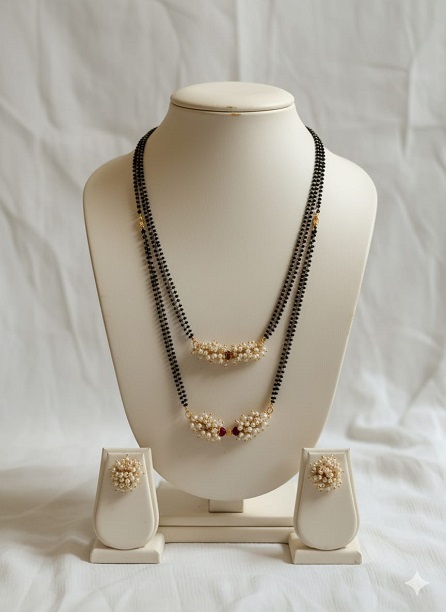 मंगळसूत्राच्या मध्यभागी असलेला आकर्षक Pearl Cluster Pendant हे याचे खास वैशिष्ट्य आहे. नाजूक पांढऱ्या पर्ल्ससोबत दिलेले छोटे रंगीत स्टोन (Red Stone Accent) डिझाइनला अधिक उठावदार बनवतात. डबल लेयर लांबीमुळे हा सेट गळ्यात खूपच ग्रेसफुल दिसतो.