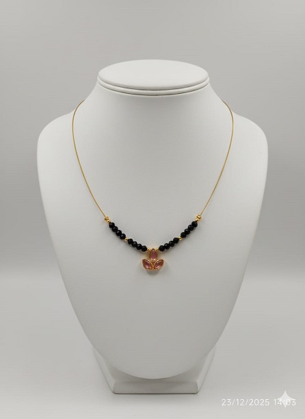 हा सुंदर आणि नाजूक Designer Mangalsutra पारंपरिक महत्त्व आणि आधुनिक डिझाइन यांचा अप्रतिम संगम आहे. बारीक Gold Chain सोबत मधोमध लावलेले काळे मणी (Black Beads) मंगळसूत्राची पारंपरिक ओळख जपतात.