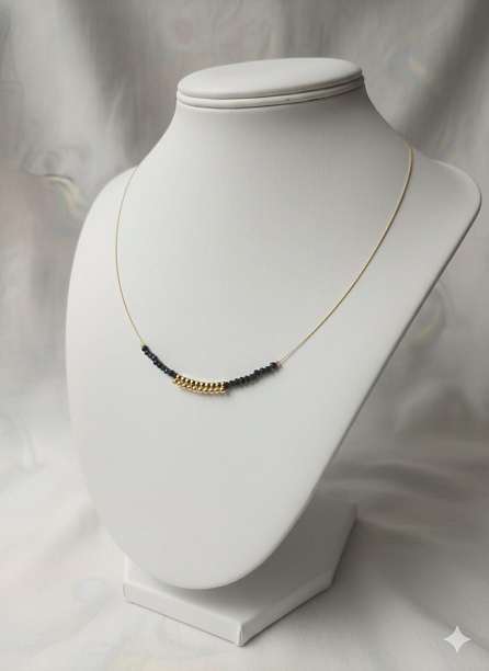 हा अत्यंत साधा आणि एलिगंट Minimalist Mangalsutra आधुनिक डिझाइन आवडणाऱ्या महिलांसाठी खास तयार केलेला आहे. बारीक Gold Chain वर मधोमध दिलेले काळे मणी (Black Beads) आणि सोनेरी मणी (Gold Beads) यांचे सुंदर कॉम्बिनेशन या मंगळसूत्राला क्लीन आणि स्टायलिश लुक देते.
