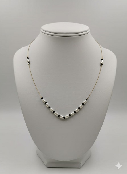 हा नाजूक आणि एलिगंट Pearl Mangalsutra पारंपरिक मंगळसूत्राला आधुनिक टच देणारा खास डिझाइन आहे. बारीक Gold Chain वर मधोमध दिलेले पांढरे मोती (White Pearls) आणि लहान काळे मणी (Black Beads) यांचे सुंदर कॉम्बिनेशन या मंगळसूत्राला सॉफ्ट आणि क्लासिक लुक देते.
